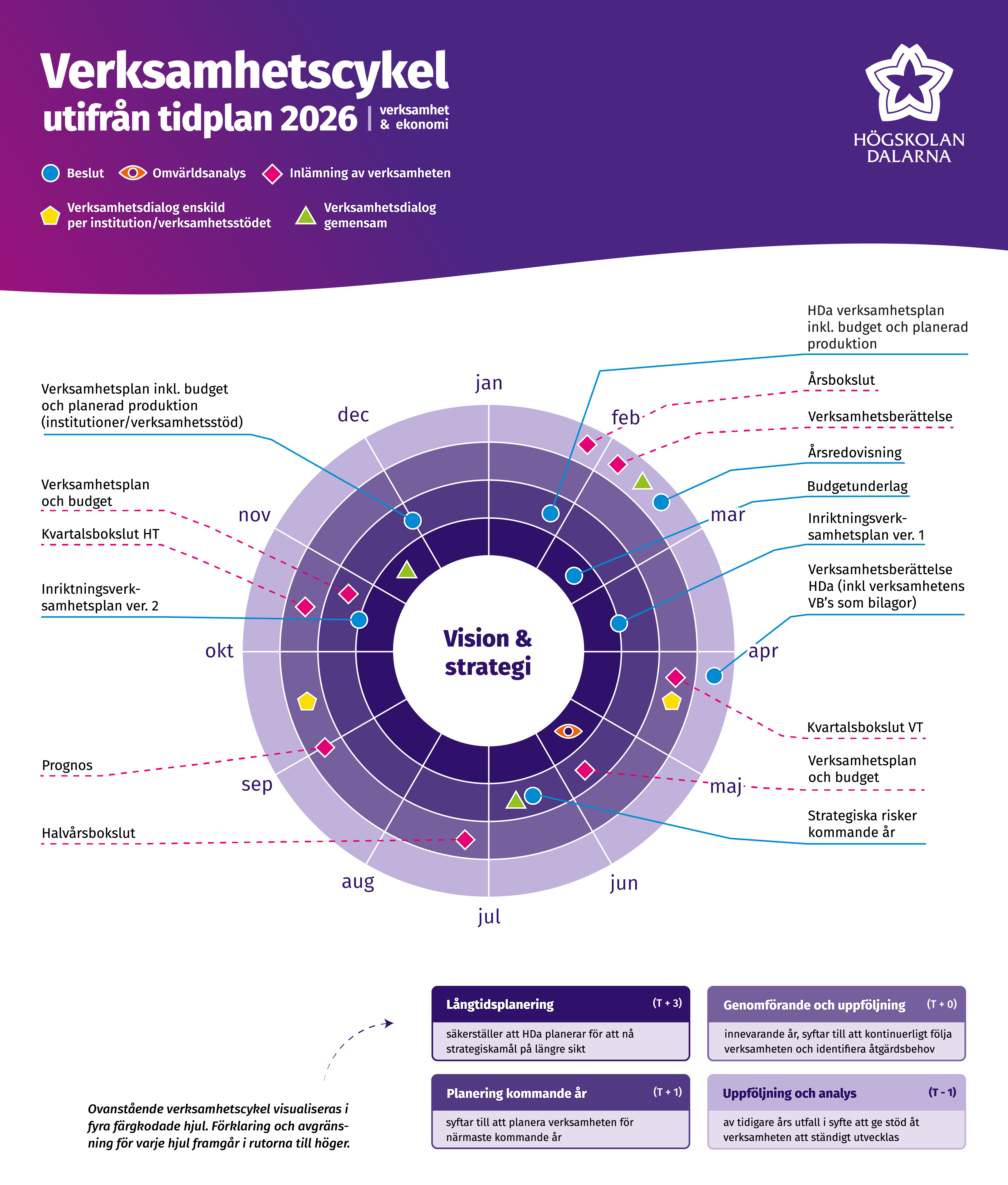 Bilden nedan visar ett övergripande årshjul av Högskolan Dalarnas verksamhetscykel sett utifrån verksamhetsåret 2026. Som bilden visar pågår processer för minst fyra parallella år samtidigt, som ska leda till kontinuerlig utveckling av verksamheten.