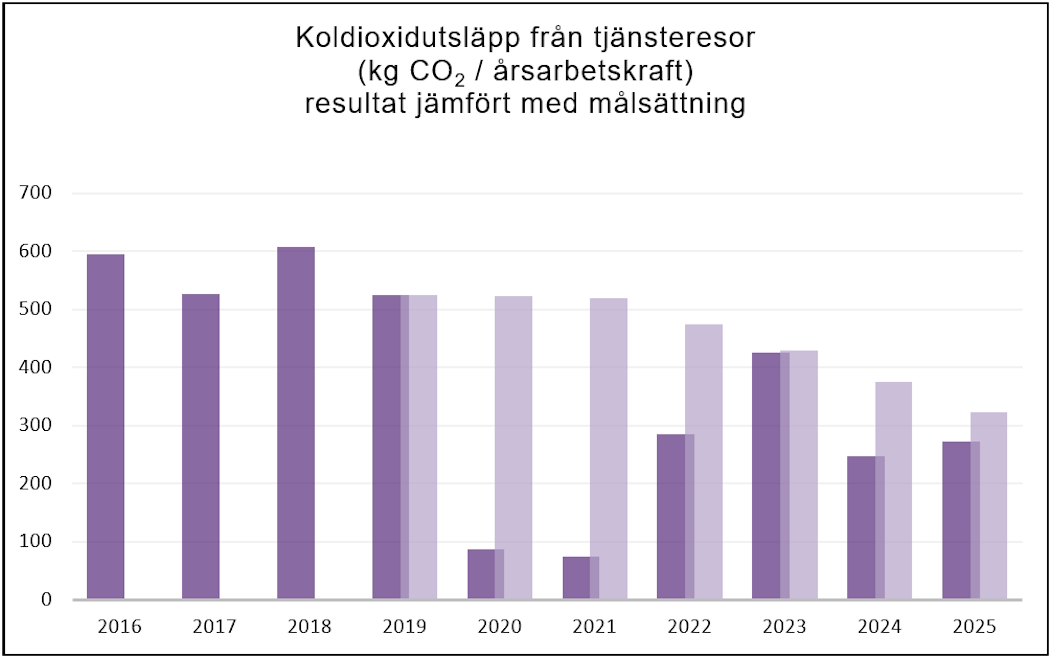 "Klimatpåverkan från tjänsteresor ska minska med 6 procent per år. Resfria möten ska vara ett fungerande alternativ för alla medarbetare och ska alltid övervägas, med hänsyn till det aktuella mötets krav på effektivitet, tillgänglighet och kreativitet."